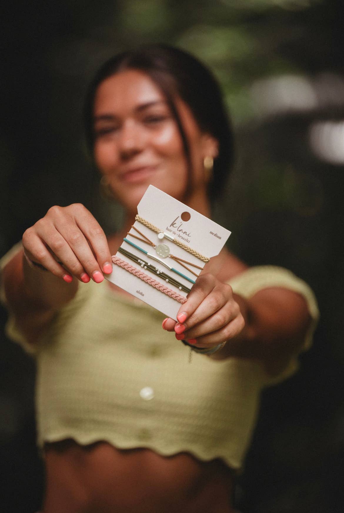 Our ALOHA set includes five bracelets that double as hair ties in vibrant tropical colors that enhance the silver Hawaiian islands charm. Wearing this bracelet stack will remind you to breathe in, breathe out and carry the spirit of Aloha.