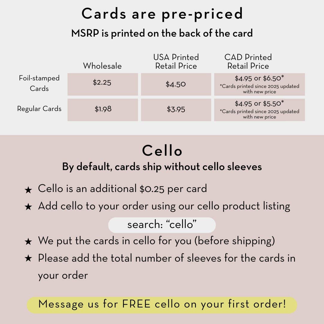 • By default cards come without cello packaging. Cello can be added to your order using our cello listing for an additional $0.25 each.
