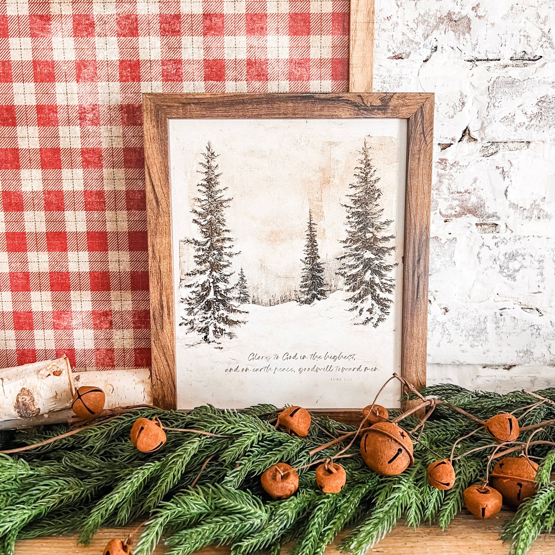 Vintage holiday sign with Luke 2:14 verse and rustic tree background. Perfect for a holiday mantle or shelf display and to layer with other signs! Framed in medium light colored frame.